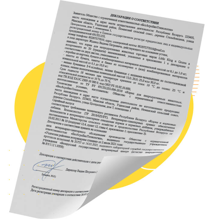 Продукты Little King соответствуют требованиям технического регламента Республики Беларусь «Корма и кормовые добавки. Безопасность», Ветеринарно-санитарным правилам обеспечения безопасности в ветеринарно-санитарном отношении кормов и кормовых добавок, утверждённых постановлением Министерства сельского хозяйства и продовольствия Республики Беларусь.